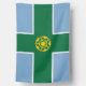 This design features the historic flag of the county of Derbyshire, which is located in the East Midlands of England. A large part of the Peak District National Park lies within the county of Derbyshire, and the Pennine range of hills which extends into the north of the county. Derbyshire borders West Yorkshire to the north; South Yorkshire to the north-east; Nottinghamshire to the east; Leicestershire to the south-east; Staffordshire to the west and south-west; Cheshire also to the west; and Greater Manchester to the north-west. Kinder Scout, at over 2,000 feet, is the highest point in the county. Major settlements in the traditional county of Derbyshire include Derby, Chesterfield, Long Eaton, Ilkeston, Swadlincote, Belper, Dronfield, Buxton, Ripley, Staveley, Glossop, Heanor, Bolsover and Eckington.
