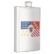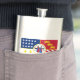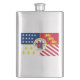 Flask with flag of city of Detroit, Michigan; red, white and blue flag with stars and stripes, fleur-de-lys, dragons and seal of the city