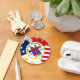 Button Keychain with flag of city of Detroit, Michigan; red, white and blue flag with stars and stripes, fleur-de-lys, dragons and seal of the city