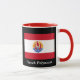 The flag of French Polynesia was adopted in 1984. Two red horizontal bands encase a wide white band in a 1:2:1 ratio; centered on the white band is a disk with a blue and white wave pattern depicting the sea on the lower half and a gold and white ray pattern depicting the sun on the upper half; a Polynesian canoe rides on the wave pattern; the canoe has a crew of five represented by five stars that symbolize the five island groups; red and white are traditional Polynesian colors.