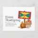 Stylish, patriotic GRENADIAN THANKSGIVING Holiday Postcard, showing the map outline and flag of GRENADA & CARRIACOU on a banner pole with a pumpkin and autumn fall leaves against a white background. On the front, the wording says HAPPY THANKSGIVING - THANK YOU LORD FOR YOUR FAITHFULNESS AND FOR ALL YOU HAVE DONE. On the back, there is a CUSTOMIZABLE message, which you can change for your own choice. Also comes with black background.