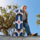 Skateboard with flag of city of Indianapolis, Indiana; blue flag with white cross and red circle with white star in the center