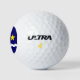 Golf balls with design design with flag of Kinshasa, capital city of Democratic Republic of Congo, blue flag with white wave, two golden stars and letter ‘K’ in the center