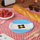 Paper plate with flag of city of Madison, Wisconsin; light blue and white flag with a black cross and yellow circle in the center