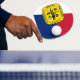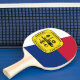Ping pong paddle with flag of city of Memphis, Tennessee; red, white and blue flag with yellow emblem with an illustration of ship