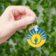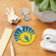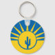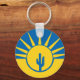 Button Keychain with flag of city Mesa, Arizona; yellow and blue flag with stylized illustrations of desert, cactus and rising sun