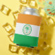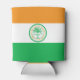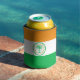 Can cooler with flag of city of Miami, Florida; flag with three horizontal bands of orange, white and green with emblem with an illustration of a palm tree in the center