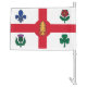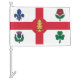 Car Flags with the flag of Montreal, the most populous city in the province of Quebec, Canada. A white flag with a red cross, a white pine, a blue Fleur-de-lys, a red Rose of Lancaster, a shamrock, and a thistle