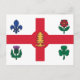 Postcard with the flag of Montreal, the most populous city in the province of Quebec, Canada. A white flag with a red cross, a white pine, a blue Fleur-de-lys, a red Rose of Lancaster, a shamrock, and a thistle