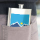 Flask with a design with the flag of Orem, Utah. A blue, white, and yellow flag with mountain peaks and the sun in the center