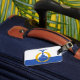 Luggage with a design with the flag of Orlando, Florida. A blue and white flag with the lake Eola fountain in the center
