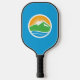 Pickleball Paddle with a design with the flag of Provo, Utah. A blue flag with the Provo City logo in the center. The logo represents the Utah lake and nearby mountain peaks with the rising sun in the background