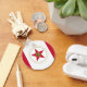 Button Keychain with flag of city of Raleigh, North Carolina; flag with three vertical bands of red and white with city’s seal in the center