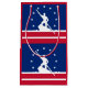 Paper bag with flag of city of Richmond, Virginia; blue flag with red and white stripes, with white stripes and silhouette of man working James river bateau down the James river