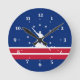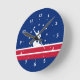 Clock with flag of city of Richmond, Virginia; blue flag with red and white stripes, with white stripes and silhouette of man working James river bateau down the James river