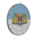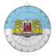 Dartboard with design with flag of Riga, capital city of Latvia; white and blue flag with coats of arms with two golden lions holding a shield in the center