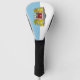 Golf driver cover with design with flag of Riga, capital city of Latvia; white and blue flag with coats of arms with two golden lions holding a shield in the center