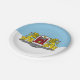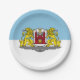 Paper Plate with design with flag of Riga, capital city of Latvia; white and blue flag with coats of arms with two golden lions holding a shield in the center