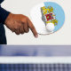 Ping pong paddle with design with flag of Riga, capital city of Latvia; white and blue flag with coats of arms with two golden lions holding a shield in the center