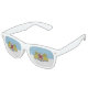 Sunglasses with design with flag of Riga, capital city of Latvia; white and blue flag with coats of arms with two golden lions holding a shield in the center