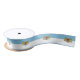 Ribbon with design with design with flag of Riga, capital city of Latvia; white and blue flag with coats of arms with two golden lions holding a shield in the center