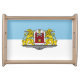 Serving tray with design with flag of Riga, capital city of Latvia; white and blue flag with coats of arms with two golden lions holding a shield in the center