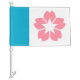 A car flag with a design with the flag of Salem, Oregon. A white and blue flag with a pink cherry blosson