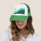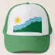 Hat with a design with the flag of Spokane, Washington. A white and green flag with blue lines symbolizing the Spokane river and Spokane Falls and a yellow sun