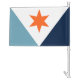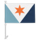 A car flag with a design with the flag of Syracuse, New York. A blue, white, and yellow flag