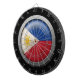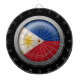 This unique graphic features the flag of The Philippines set inside of a circular metal frame. The Filipino flag has the appearance of being under a piece of glass with a light reflection visible at the top of the design. The flag has a rough texture added which contrasts the smooth finish of the stainless steel frame. This circular flag pattern is a stylish way to show off your patriotism.
