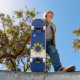 Skateboard with a design with the flag of Topeka, Kansas. A blue and white flag with a yellow star symbol