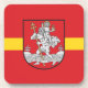 Coasters with design with flag of Vilnius, capital city of Lithuania; red flag with yellow stripe and coats of arms with two golden lions holding a shield in the center