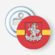 Button bottle opener with design with flag of Vilnius, capital city of Lithuania; red flag with yellow stripe and coats of arms with two golden lions holding a shield in the center