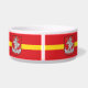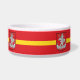 Pet Bowl with design with flag of Vilnius, capital city of Lithuania; red flag with yellow stripe and coats of arms with two golden lions holding a shield in the center