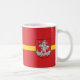 Mug with design with design with flag of Vilnius, capital city of Lithuania; red flag with yellow stripe and coats of arms with two golden lions holding a shield in the center