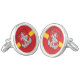 Cufflinks with design with flag of Vilnius, capital city of Lithuania; red flag with yellow stripe and coats of arms with two golden lions holding a shield in the center