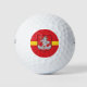 Golf balls with design with flag of Vilnius, capital city of Lithuania; red flag with yellow stripe and coats of arms with two golden lions holding a shield in the center