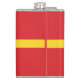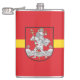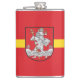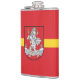 Flask with design with flag of Vilnius, capital city of Lithuania; red flag with yellow stripe and coats of arms with two golden lions holding a shield in the center