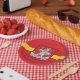 Paper plate with design with flag of Vilnius, capital city of Lithuania; red flag with yellow stripe and coats of arms with two golden lions holding a shield in the center