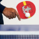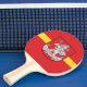 Ping pong paddle with design with flag of Vilnius, capital city of Lithuania; red flag with yellow stripe and coats of arms with two golden lions holding a shield in the center