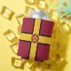 Can cooler with design with a flag of historic county of Northamptonshire, in England, Great Britain; maroon flag with a gold cross and the county’s traditional rose in the centre