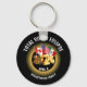 Stylish 2024 TOTAL SOLAR ECLIPSE Souvenir keychain in BLACK, with CUSTOMIZABLE TEXT, to celebrate the Total Solar Eclipse over Continental USA, Canada and Mexico in April 2024. The CUSTOMIZABLE TEXT reads TOTAL SOLAR ECLIPSE plus [FAMILY NAME]. The design shows the flags of the USA, Canada and Mexico appearing to arise out of 3D 2024. In the background is the eclipse and gold-colored corona. You can use the top curved text field for a longer sentence if required (and delete the bottom curved text). You can also personalize the top and bottom text. Buy a matching total eclipse sweater or tee shirt for all the family or for your watch party guests! Buy this solar eclipse keychain as a souvenir favor gift of the event! The totality will be totally worth it and you'll have a great reminder to cherish.