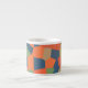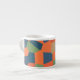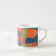 An eye-catching Espresso coffee mug, with an abstract pattern in vibrant colours - Flaming Orange, Midnight Blue and Deep Green, from a digital design by Judy Adamson.