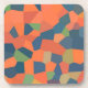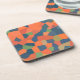 A set of eye-catching cork-backed Coasters or Table Mats, with an abstract pattern in vibrant colours - Flaming Orange, Midnight Blue and Deep Green, from a digital design by Judy Adamson.