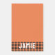 Rustic flame orange sticky notepad personalized with your name in large white bold letters at the bottom of the notepad against a background of orange buffalo check. Personalized notepad with a pumpkin orange buffalo check detail, your name in large bold letters, and a strong shade of orange that will make your notes and reminders hard to miss!