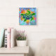 A digitally painted green sea turtle with a patterned shell against a background of orange kelp like flames. Colorful original sea turtle art. This clock has Roman numerals.