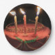 A Birthday Cake shot closeup with flaming Candles that's bright and colorful that's on a Paper Plate.