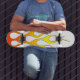 A graphic design of fire with flames in shades of orange, red and yellow. Choose your deck style and shape. See Extra Selection for trucks and wheels, full assembly, etc.