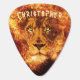 Golden flames and a burning lion image with a customizable name positioned like a lion's crown. Rock music, heavy metal flaming lion. Flaming Lion Named Guitar Pick