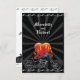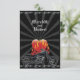 Hit the open road with a wedding response card that reflects your love as a couple for your bike(s). A graphic outlined motorcycle is accented by a flaming heart against a rich black grungy burst background with a top and bottom border of thin chrome flames. The motorcycle image is twice repeated on the reverse to emphasize the RSVP information. Available with matching products.